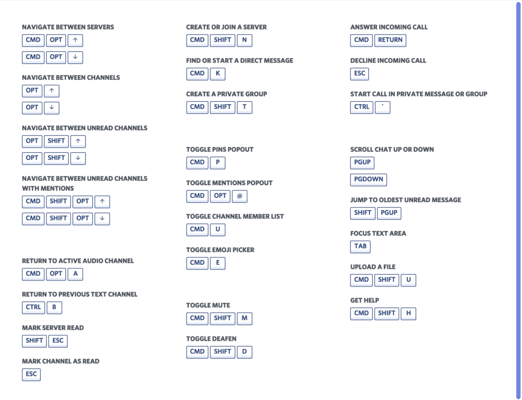 После того, как вы загрузили и установили приложение Discord на свой ПК, вам стоит изучить сочетания клавиш для быстрого использования Discord. Это облегчит вам выполнение различных задач. Когда вы запомните горячие клавиши, вам не нужно будет рыскать в различных меню в поисках нужного действия. Вы можете найти полный список горячих клавиш на картинке ниже.